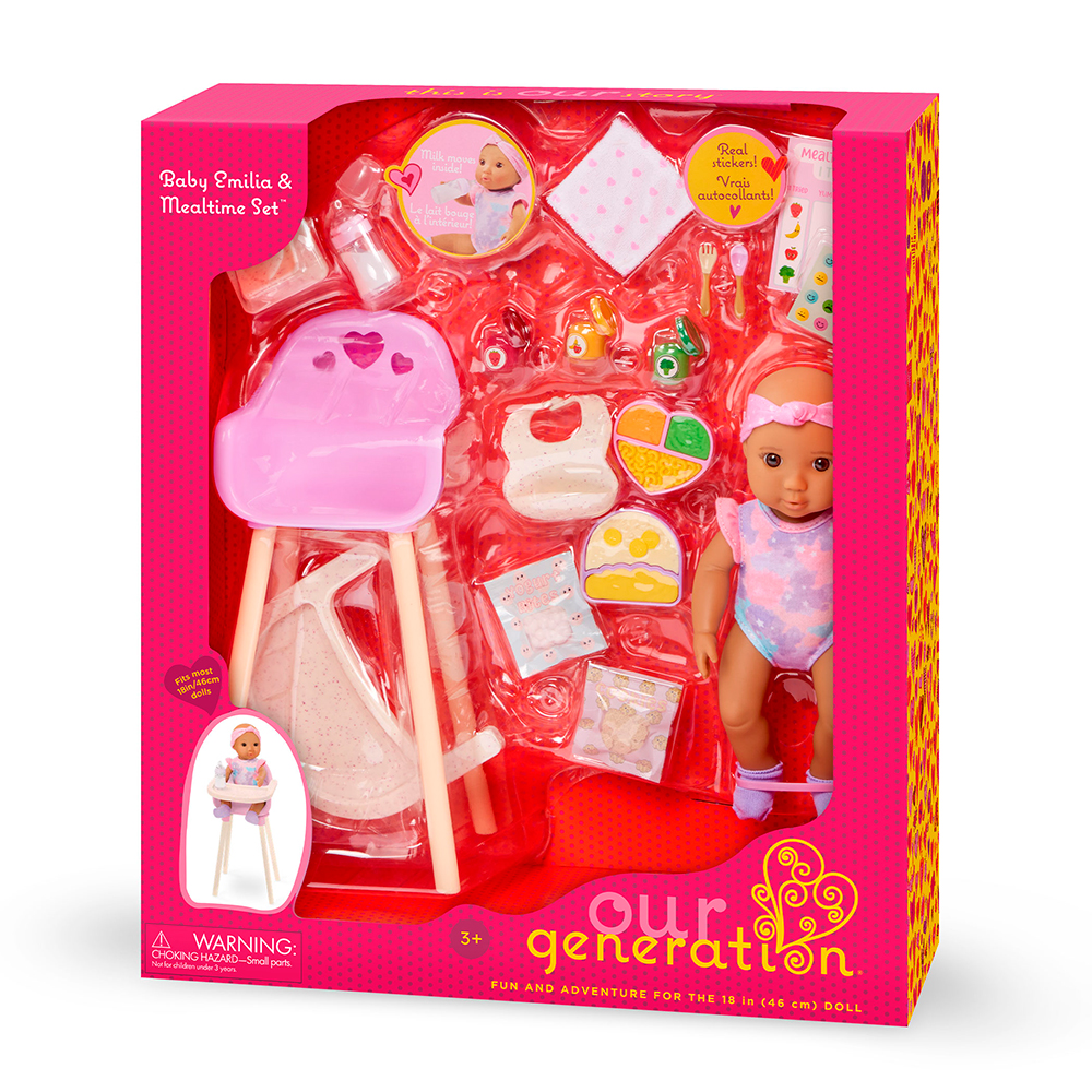 Our GenerationOffrez des moments de joie avec le set Bébé Emilia et Repas de Our Generation! Ce coffret adorable offre aux enfants tout le nécessaire pour recréer les repas du quotidien et s'amuser à donner le goûter. Installez Emilia dans sa chaise haute et mettez-lui son bavoir pour le premier plat. Les enfants adoreront « prendre » les aliments factices dans les assiettes et les pots avec les couverts. De plus, le biberon interactif est rempli de faux lait qui bouge vraiment, tandis que les sachets de biscuits et de yaourt révèlent des mini-morceaux d'aliments à déguster. Un tableau des repas aide les enfants à découvrir la nutrition et les aliments sains, et des autocollants leur permettent de noter chaque nouvel aliment goûté! Emilia porte une tenue facile à changer, composée d'un body coloré, d'un bandeau assorti et de chaussettes douillettes. Elle est également fournie avec un gant de toilette et une boîte de lingettes pour bébé pour des moments de nettoyage amusants.