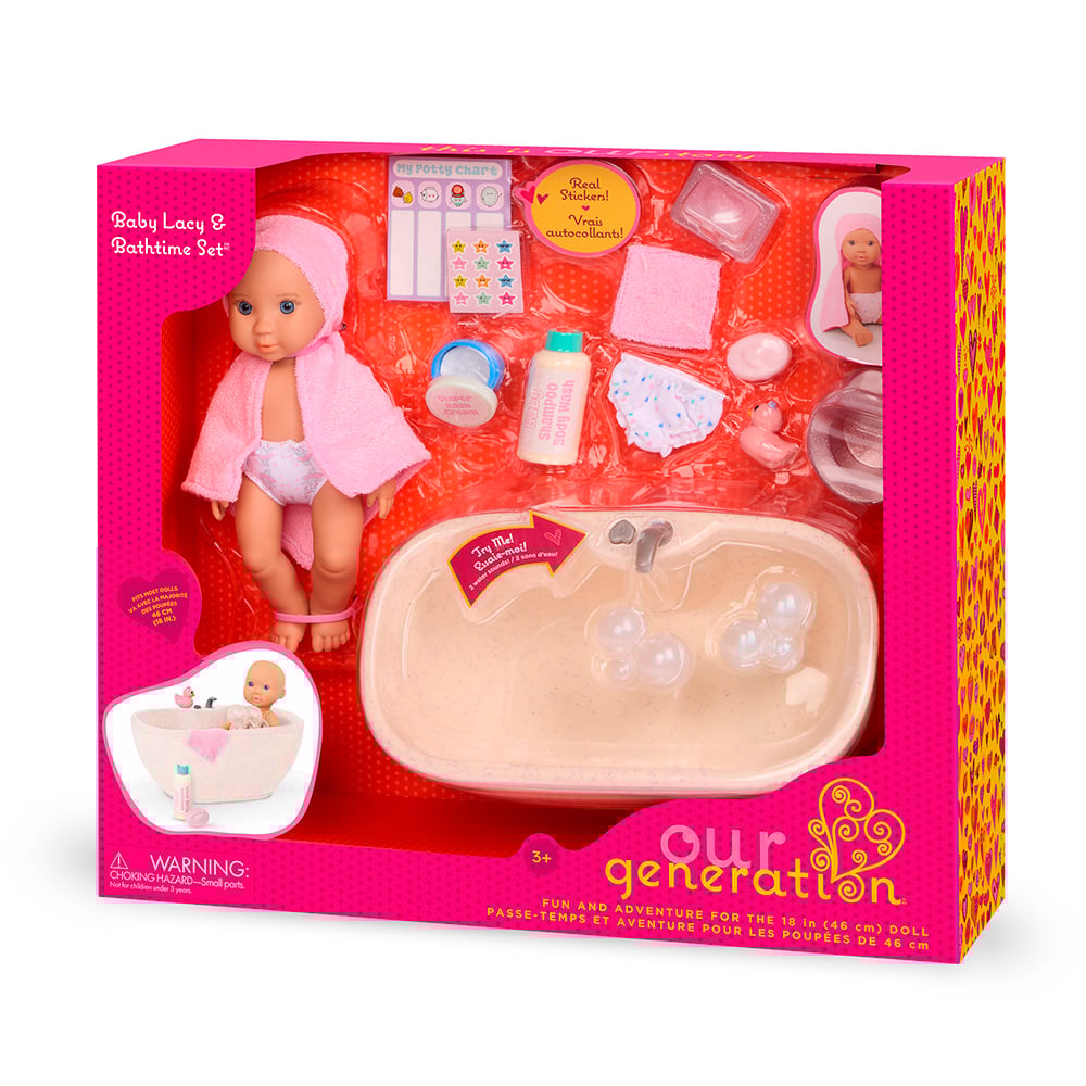 Plouf, éclaboussez et donnez un bain à bébé avec le coffret Our Generation Baby Lacy et son bain!Cet adorable ensemble de jeu offre aux enfants tout le nécessaire pour prendre soin de la poupée Lacy. Prêts pour le bain? Appuyez sur le bouton de la baignoire pour entendre l'eau couler et « remplir » la baignoire. Une fois Lacy dans la baignoire, ajoutez les bulles de bain et le canard en plastique pour encore plus de plaisir. Appuyez ensuite à nouveau sur le bouton pour activer un bruit d'éclaboussures et profiter d'un jeu de rôle réaliste! Un pot et un tableau d'apprentissage de la propreté aident les enfants à acquérir les bonnes habitudes d'hygiène, de la chasse d'eau au lavage des mains. De plus, la planche d'autocollants incluse leur permet de marquer fièrement chaque progrès! Des accessoires thématiques comme la serviette à capuche, le gant de toilette, la crème pour le change, le shampoing, le savon, les lingettes pour bébé et les couches complètent l'ensemble et enrichissent les histoires.