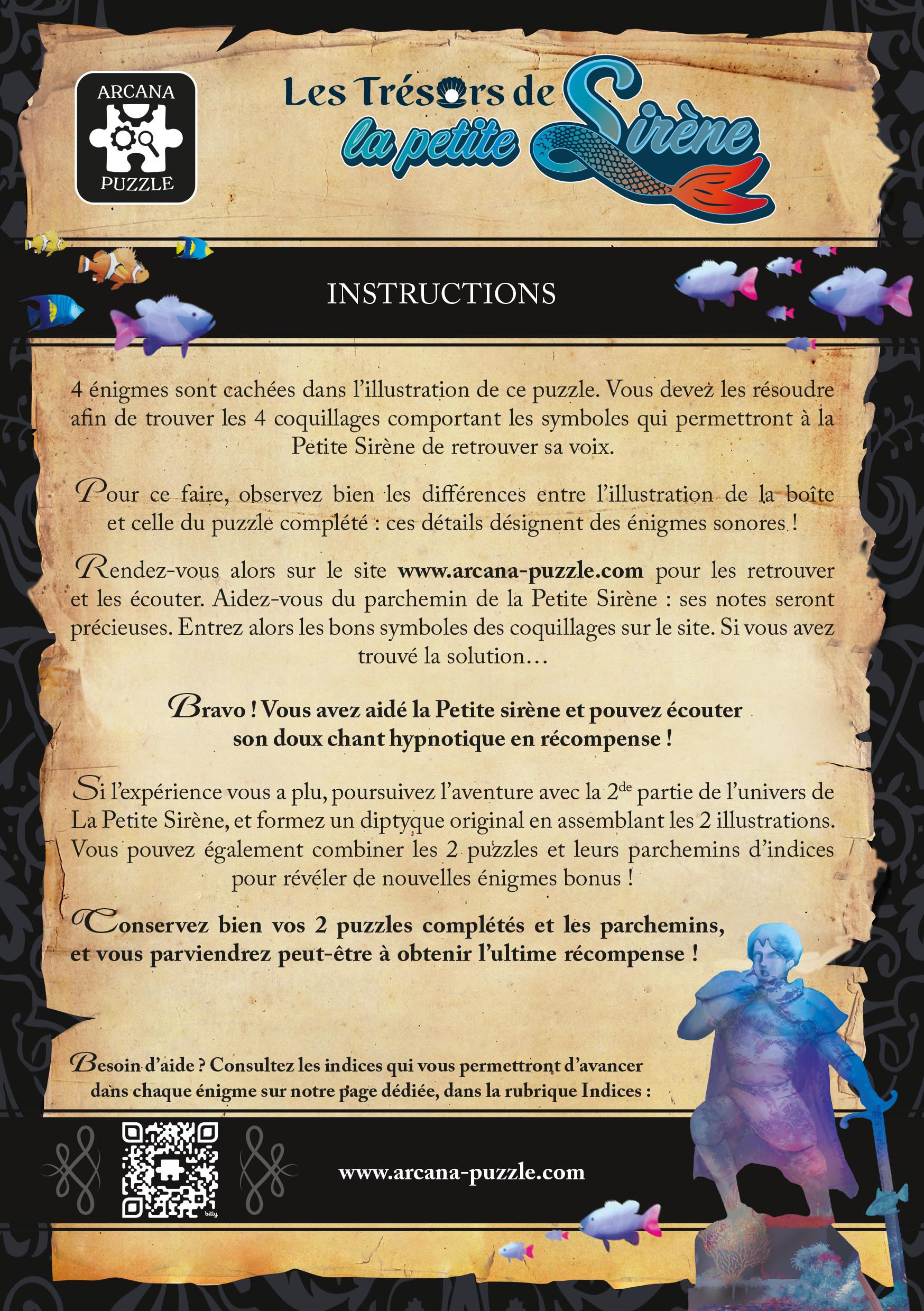 But du jeu: Construire le casse-tête et résolvez les énigmes sonores cachées dans l’illustration du casse-tête.Comment aider La Petite Sirène à défaire le maléfice de la Sorcière des mers? Résolvez les énigmes sonores cachées dans l’illustration du casse-tête afin de trouver les bons symboles des coquillages. Rendez-vous sur le site Arcana pour les énigmes et la récompense !