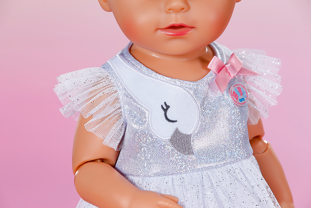 ZapfLever de rideau pour BABY born dans sa tenue de ballerine! Une robe élégante et scintillante d'un blanc sobre, brodée de cygnes, avec un petit nœud et une jupe tutu qui se balance, est une tenue de scène plus qu'adéquate - avec des chaussons de ballet argentés et un serre-tête, la tenue est littéralement couronnée. Toi, Toi, Toi!