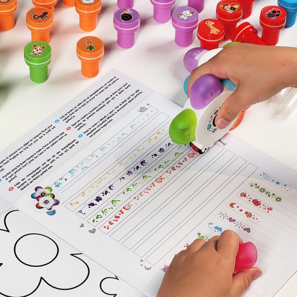 Grâce au livret d’activités de 20 pages, l’enfant pourra colorier, créer et tamponner sur les décors fournis.