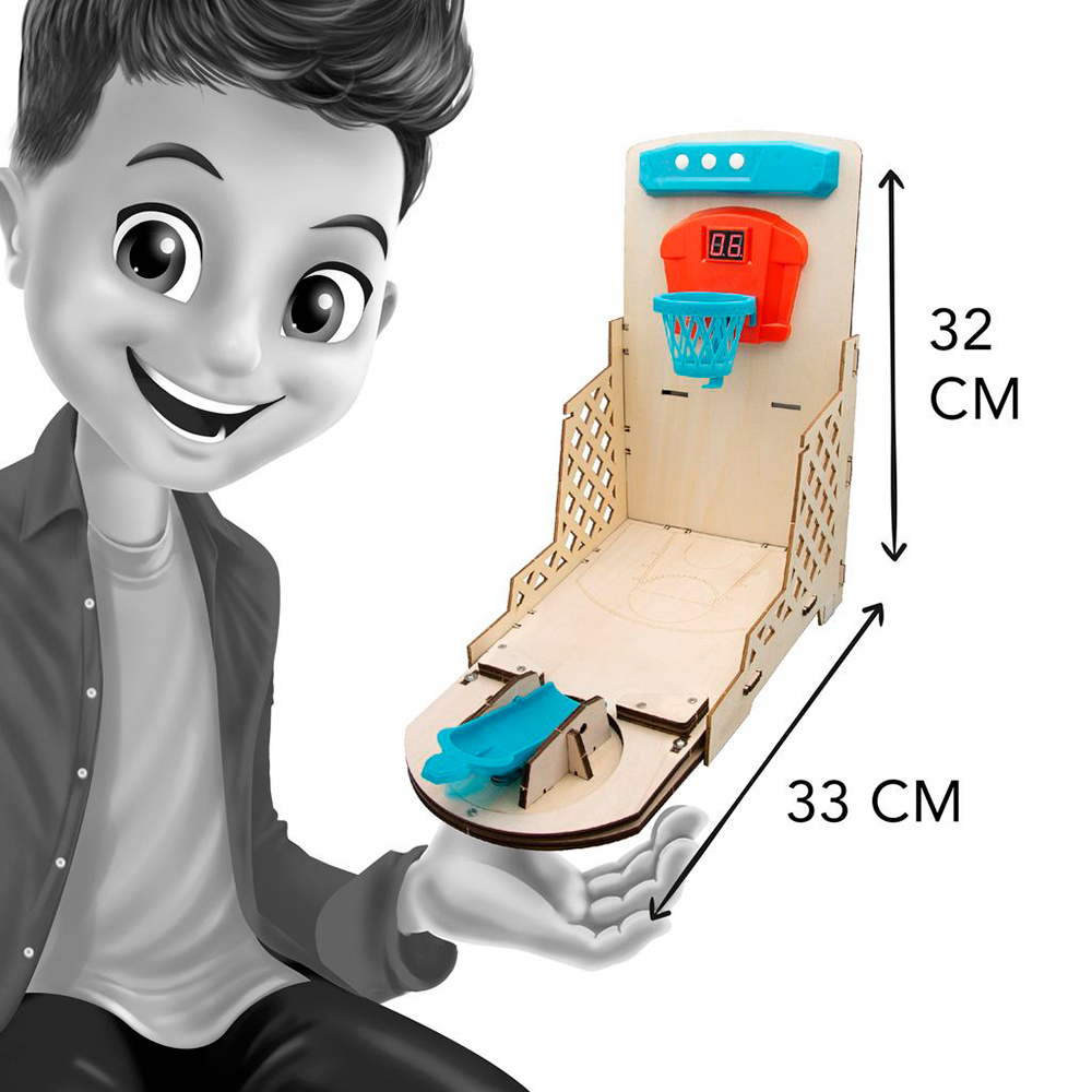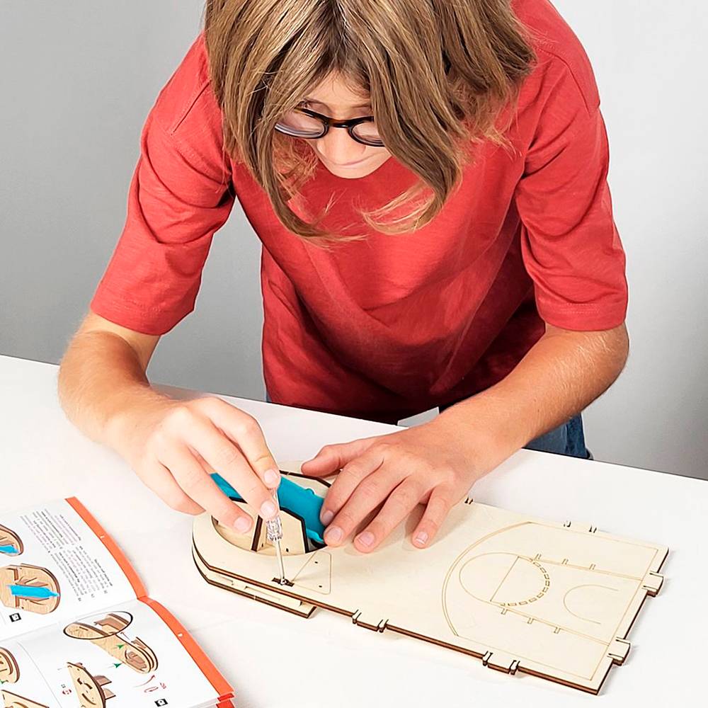 BukiUn coffret pour monter son panier de basket électronique. Avec le tournevis inclus, l’enfant va assembler sans soudure et sans danger : le tableau des scores, le panneau de contrôle, le haut-parleur et le compartiment à piles. Personnalise le panier avec les autocollants.