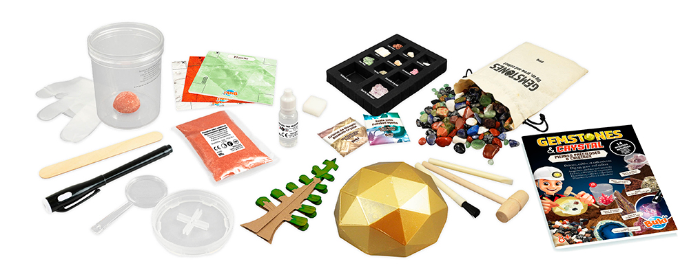 BukiDeviens un expert des pierres précieuses et des cristaux avec les 27 pierres authentiques incluses. Réalise des expériences pour découvrir leurs propriétés. Avec les outils, déterre 8 véritables pierres brutes. Trouve leurs versions polies dans le sac (300 g) et compare-les avec la loupe.