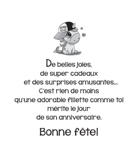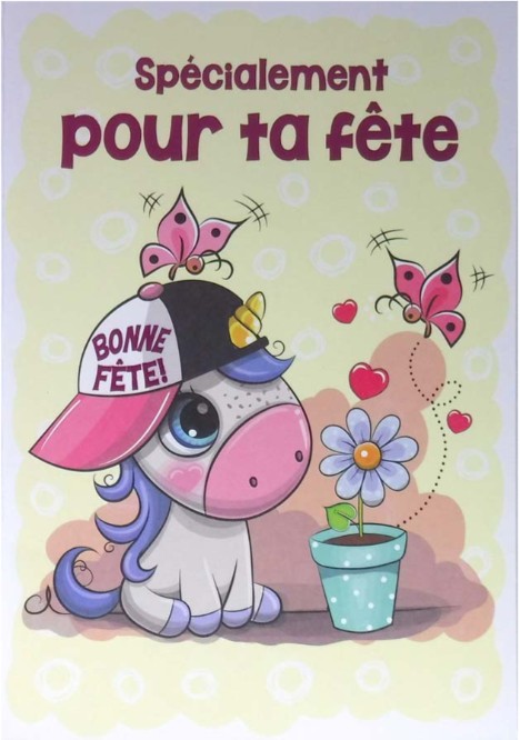 Une carte d’anniversaire adorable et colorée, parfaite pour célébrer la fête d’une fillette. La couverture met en vedette une jolie petite licorne aux grands yeux attendrissants, portant une casquette « Bonne fête ! ». Autour d’elle virevoltent des papillons roses et un petit pot de fleur ajoute une touche de tendresse. Le tout est accompagné du texte : « Spécialement pour ta fête » en caractères ludiques et festifs.🖊️ Texte à l’intérieur