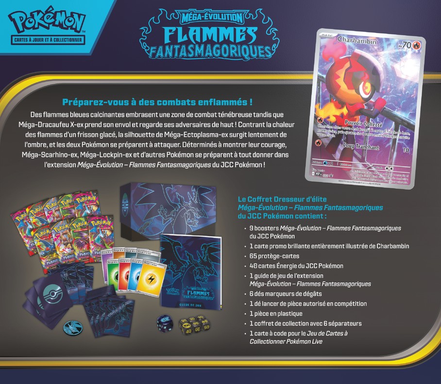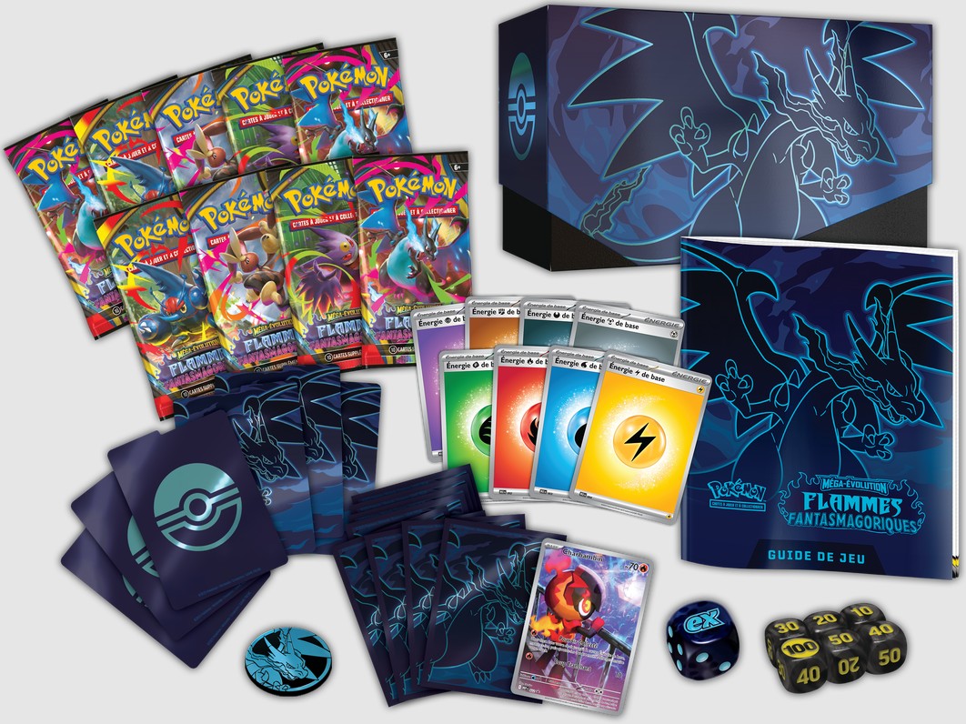 Le Coffret Dresseur d'élite Méga-Évolution – Flammes Fantasmagoriques du JCC Pokémon contient :