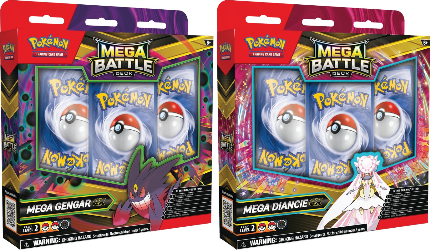 It’s Time for a Mega Battle!Two new Pokémon TCG: Mega Battle Decks are ready to rumble! Team up with Mega Gengar ex and battle from the shadows, or call upon Mega Diancie ex and dazzle opponents with your skill. Each deck includes a powerful Pokémon ex and everything you need to play right away.