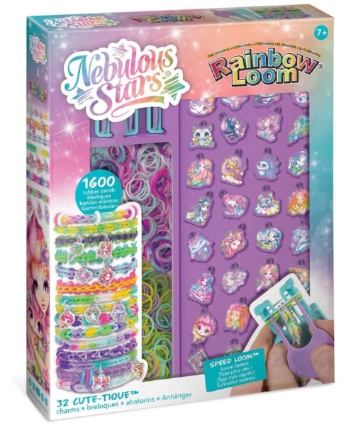 Créez des bracelets magiques Rainbow Loom® avec les breloques Cute-tique™ Nebulous Stars! Chaque breloque présente des motifs recto verso pour deux fois plus de plaisir. Utilisez le Speed Loom™ et le Dual Hook™ pour confectionner des bracelets colorés en un rien de temps. Créez, empilez et brillez!Âge: 7 +
