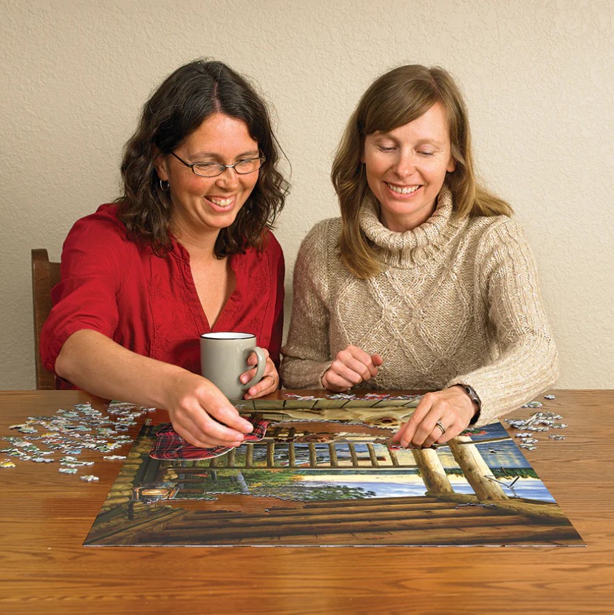 Walter s'est levé de son rocking-chair pour prendre une photo de son joyeux labrador jaune sur la véranda d'un chalet, profitant du chant des canards dans l'eau et du magnifique coucher de soleil. Un casse-tête pittoresque de 1 000 pièces réalisé par l'artiste Greg Giordano.Quatre bienfaits des casse-têtes… pour adultes