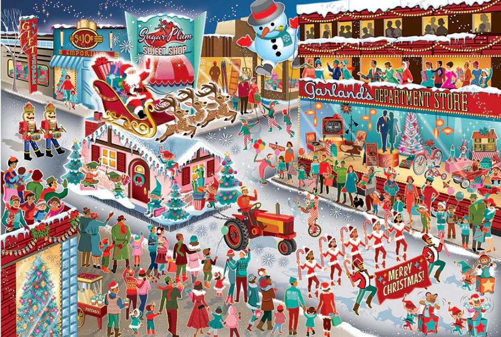La Parade du Père Noël de Diane Dempsey incarne la chaleur et le charme de la vie moderne du milieu du siècle dans une scène hivernale festive. L'esprit de Noël bat son plein lorsque la fanfare déambule dans la rue, accompagnée du chalet du Père Noël. Une foule joyeuse borde les rues, profitant de la joie des fêtes et de la ravissante vitrine du grand magasin Garland. Ce puzzle de 2000 pièces apportera à votre intérieur une ambiance festive !Quatre bienfaits des casse-têtes… pour adultes