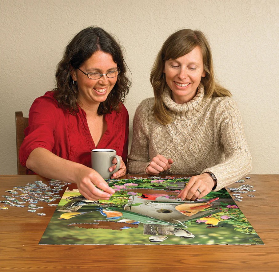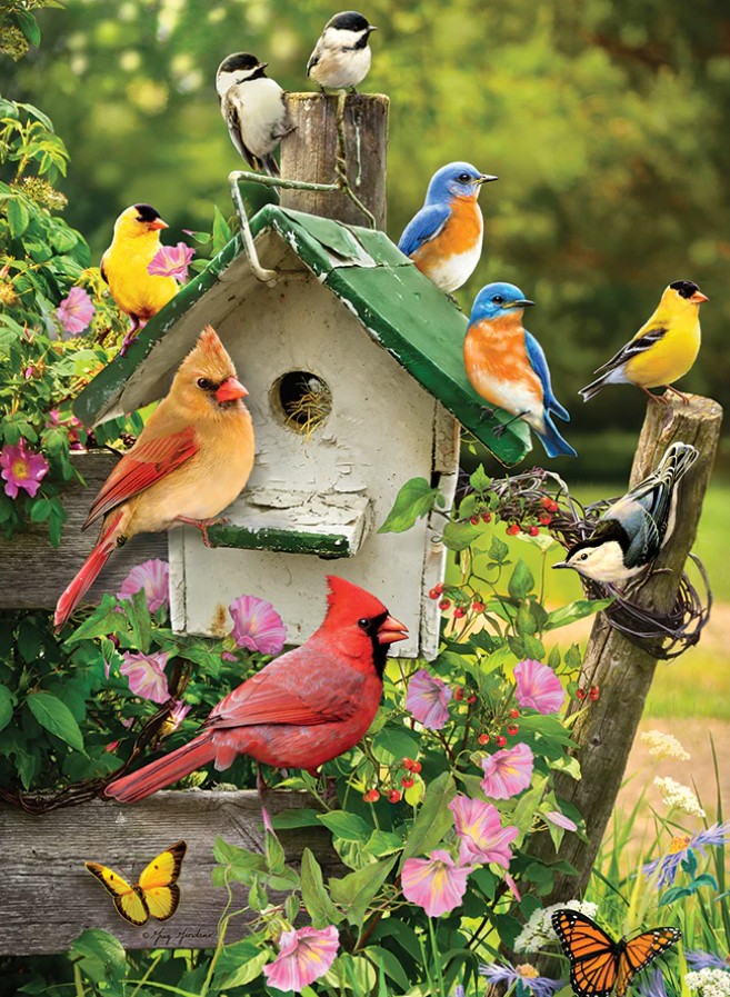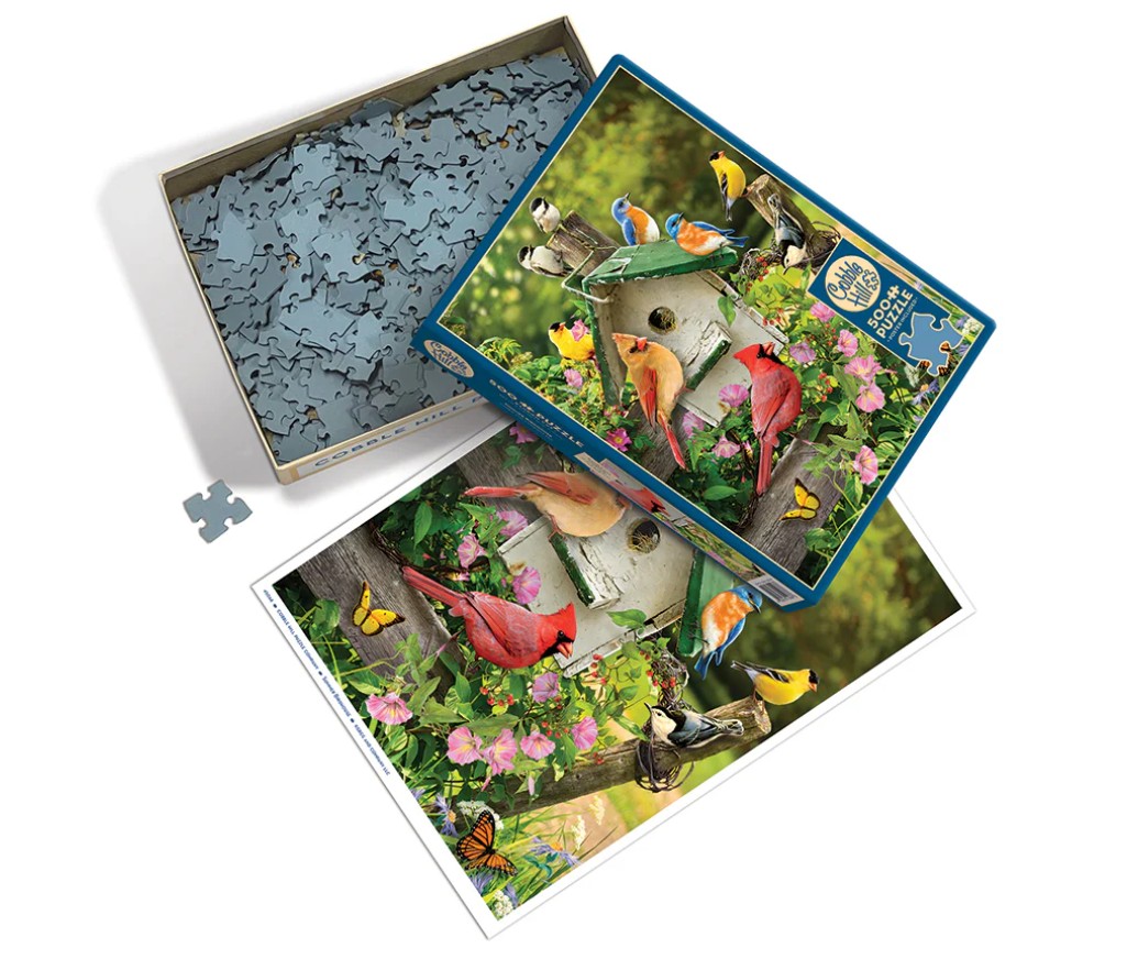 Le nichoir d'été regorge d'oiseaux aujourd'hui ! Ce casse-tête ensoleillé de 500 pièces met en scène des cardinaux, des oiseaux bleus, des sittelles, des chardonnerets jaunes et des papillons, ainsi que de magnifiques feuillages verts provenant des fleurs roses et bleues. On y retrouve également une touche de dentelle de la Reine Anne dans le coin inférieur droit. Ce nichoir en bois vieilli au toit végétal est fixé à une vieille clôture en bois. La peinture blanche s'écaille, mais les oiseaux ne s'en soucient guère ! Les oiseaux et le nichoir sont bien nets, mais le tiers supérieur du casse-tête présente un arrière-plan flou, ce qui peut rendre le casse-tête un peu plus difficile pour certains. Heureusement, les casse-têtes de 500 pièces sont plus grands, ce qui permet d'obtenir plus de détails par pièce et facilite l'assemblage ! Ce casse-tête est en orientation portrait, idéal pour ceux qui ont du mal à se pencher sur une table.Quatre bienfaits des casse-têtes… pour adultes