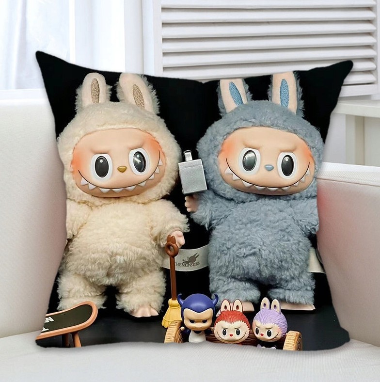 - Coussin décoratif illustrant deux Labubu en tenues peluche (beige et gris).