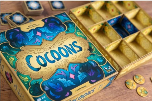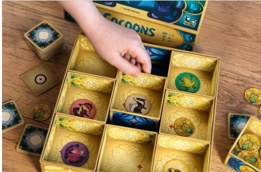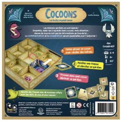 Les Animaux gardiens se sont perdus dans la forêt et ont besoin de votre aide pour retrouver leur chemin vers leurs "Cocoons". Mais attention, le défi ne sera pas facile ! Grâce à un ingénieux système de taquin, vous devrez collecter des indices pour guider les animaux, mais voici le piège : chacun de vous ne peut voir que les informations qui se trouvent devant lui. La clé de la réussite réside dans une communication claire et une coopération sans faille. Il vous faudra travailler ensemble, partager vos découvertes et vous fier à la stratégie collective pour réussir à sauver les Animaux gardiens et les ramener à bon port !Dans Cocoons, vous devez coopérer pour libérer les gardiens égarés dans la boîte, puis les replacer dans leurs cocons respectifs. À votre tour, dépensez un jeton d'action pour faire glisser un cocon, comme dans un jeu de taquin, et révéler ainsi de nouvelles informations : chaque joueur ne voit que les indices en face de lui, et il faut donc bien communiquer entre vous pour identifier les cocons ! Si vous dévoilez une trappe au fond de la boîte, ouvrez-la pour activer son effet et découvrir l'animal gardien caché dessous. Vous pouvez désormais déplacer ce gardien dans son cocon, si vous l'avez déjà localisé. Une fois que tous les gardiens ont rejoint leur cocon, retrouvez le jeton de départ pour sceller votre victoire. Mais attention : vous devez y parvenir avant d’arriver à court d’actions ! Au fil de vos parties, ajoutez de nouvelles trappes pour des défis de plus en plus relevés !