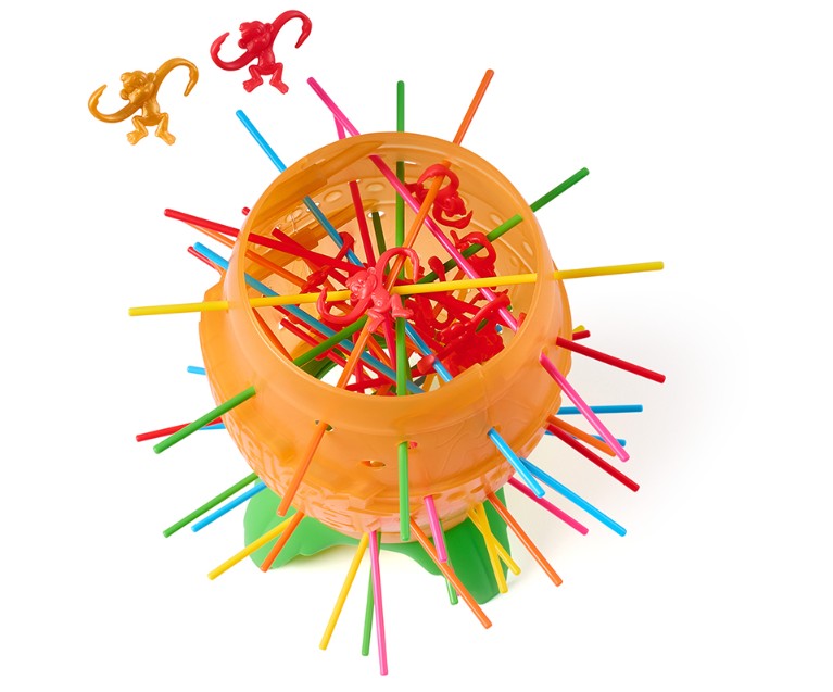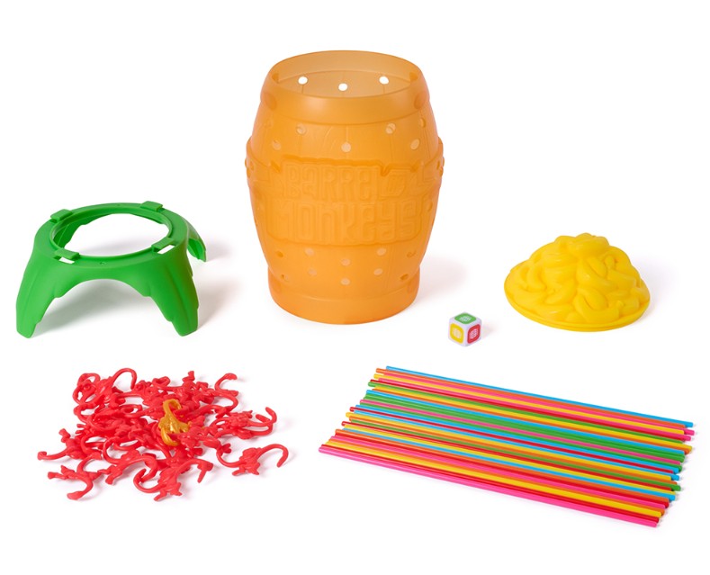 Insérez les bâtonnets au hasard dans le baril, puis ajoutez les figurines de singes de manière à ce que leurs bras s'accrochent aux bâtonnets. Lancez le dé coloré à tour de rôle et retirez prudemment un bâtonnet de la couleur indiquée par le dé, sans faire tomber aucun singe. Si vous faites tomber des singes, ajoutez-les à votre pile. Si vous obtenez le singe doré, vous pouvez retirer cinq singes rouges de votre pile et les replacer dans le baril. Une fois tous les bâtonnets retirés du baril, le joueur ayant récupéré le moins de singes gagne la partie.