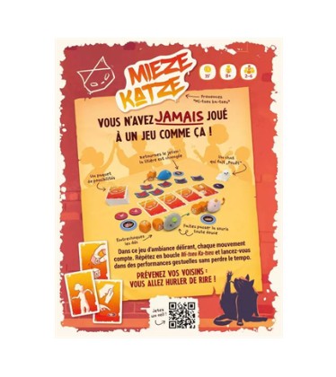 Mieze Katze est un jeu coopératif de rythme, de mémoire et de coordination, où la musique rencontre le mime dans une ambiance joyeusement absurde. Ensemble, les joueurs créent un rythme vocal collectif, en alternant les sons « Mieze » et « Katze », tout en intégrant progressivement des gestes imposés par des cartes. À chaque tour, de nouveaux défis viennent perturber la cadence : gestes physiques, sons farfelus ou variations du rythme doivent être intégrés sans jamais casser la synchronisation du groupe.Dans Mieze Katze, les joueurs se lancent dans une aventure où ils doivent coopérer pour créer des performances rythmiques, mais attention, pas question de perdre le tempo ! Chaque joueur pioche une carte qui lui indique une action à réaliser — un geste farfelu, un bruit étrange ou même un mouvement totalement improbable. Le but ? Rester parfaitement synchronisés tout en maintenant le rythme "Mieze Katze", une sorte de danse folle que tout le monde doit suivre. En gros, c'est comme être dans un groupe de musique où personne n’a la même partition, mais tout le monde essaie de ne pas éclater de rire ! Un mélange parfait de coordination, de chaos et de bonne humeur !