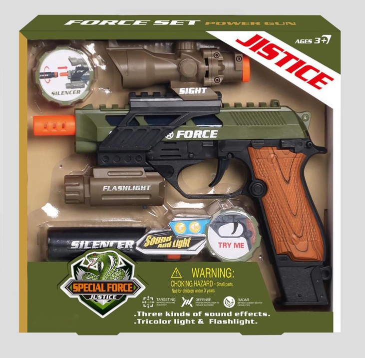 Pistolet de jeu lumineux et sonore avec silencieux, lampe et viseur. Trois effetssonores et lumières tricolores. Parfait pour les petits agents secrets