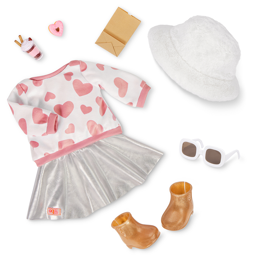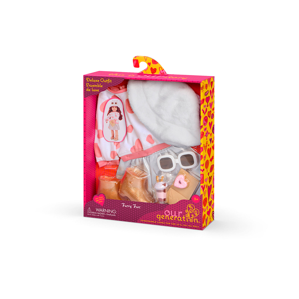 Our GenerationRépandez l'amour avec style et gourmandise! La tenue Our Generation Furry Fun permet aux enfants d'habiller leur poupée de 46 cm avec une adorable tenue pour toutes leurs aventures. Le sweat-shirt est orné de mini-cœurs roses pour un look à la fois confortable et mignon. Une jupe scintillante et un bob tendance avec lunettes de soleil complètent le look, permettant aux enfants de styliser leur poupée de la tête aux pieds. De plus, le sac à emporter contient une sélection de friandises, dont un donut et une boisson, pour enrichir les histoires!