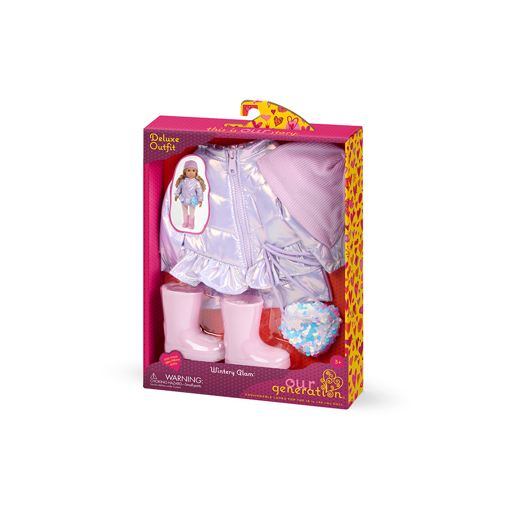 Our GenerationHabillez-vous avec style et élégance grâce à la tenue Glamour Hivernal d'Our Generation! Cet ensemble pour poupée de 46 cm comprend une doudoune métallisée que les enfants peuvent vraiment fermer. De plus, le manteau est orné de jolis volants pour une touche ludique supplémentaire. L'adorable bonnet et les hautes bottes roses rendent l'habillage encore plus amusant pour les petites fashionistas qui pourront coiffer leur poupée de la tête aux pieds. Et pour les aventures en déplacement, elles pourront emporter leurs mini-objets préférés dans le sac à main à sequins en forme de cœur!