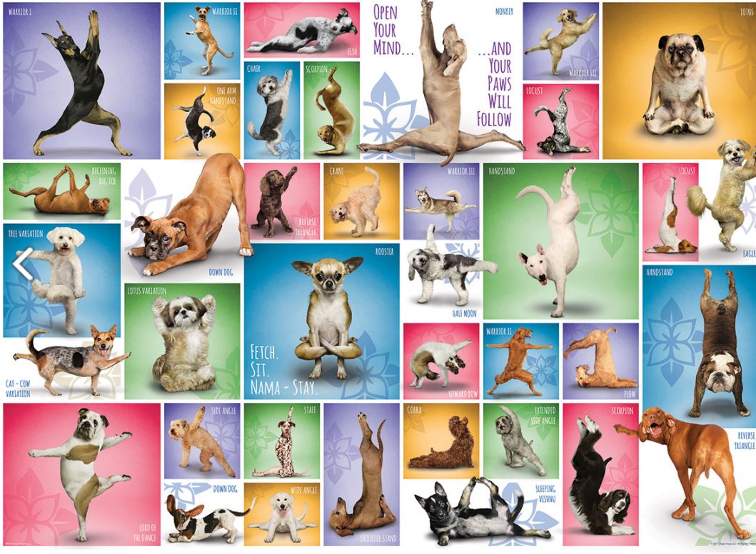 Casse-tête de 1000 morceaux avec des chiens qui font du yoga.Âge: 13 +