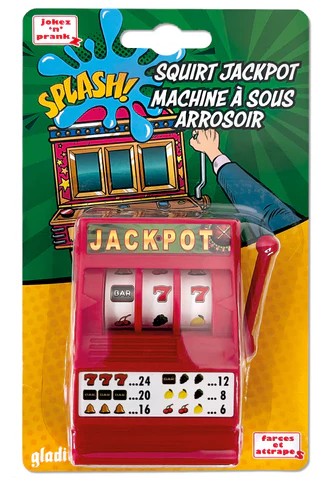 « Tentez votre chance et… SPLASH! »Pour réaliser cette blague, il suffit dans un premier temps de remplir la machine avec de l’eau. Donnez-la ensuite à votre victime et dites-lui de tester sa chance en activant la poignée. Éclatez de rire en voyant votre ami se faire arroser!