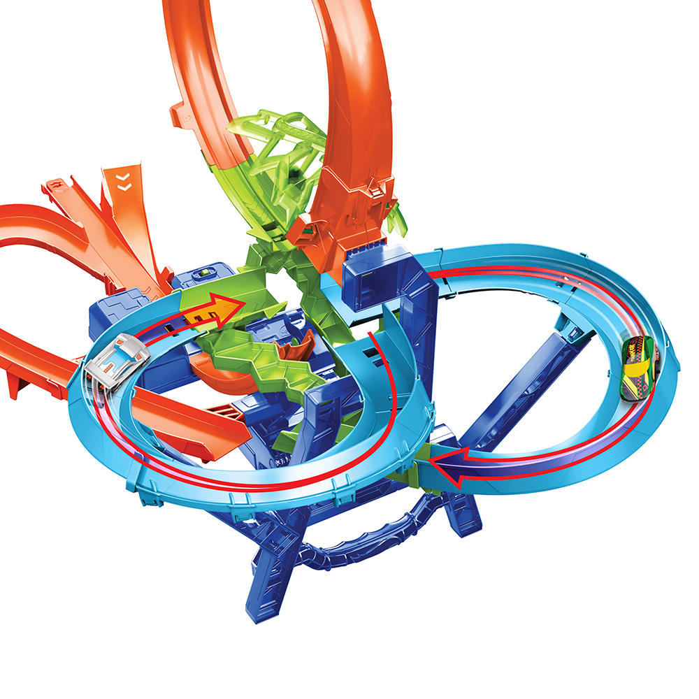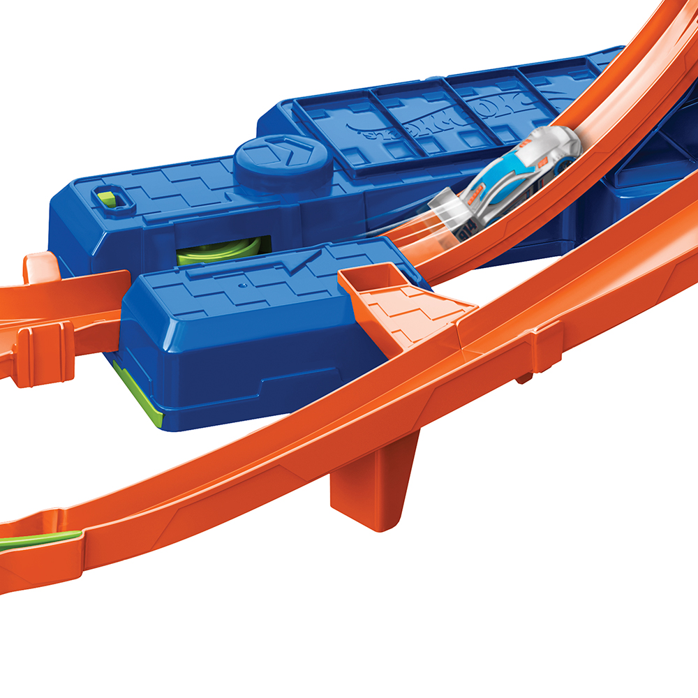 - Le propulseur motorisé lance immédiatement les voitures sur la piste, où elles enchaîneront un saut, un looping, un autre saut et deux virages avant d’être à nouveau propulsées automatiquement.