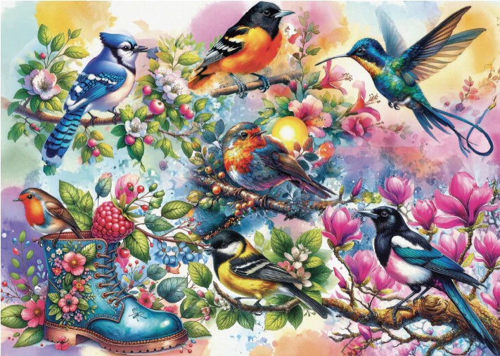 Le visuel présente une magnifique scène printanière peuplée d’oiseaux aux plumages éclatants : mésanges, colibris, geais bleus, rouges-gorges, orioles, et bien d’autres espèces perchées sur des branches fleuries. Le tout est mis en scène autour d’un charmant soulier fleuri transformé en nichoir fantaisiste.