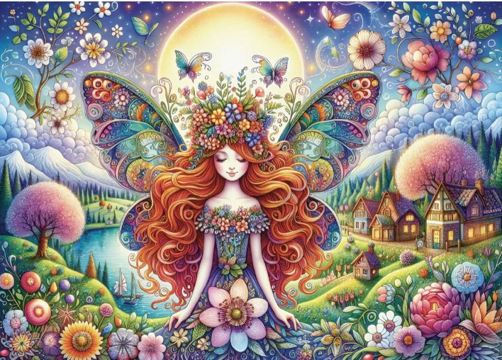 Au centre de cette œuvre délicate trône une fée lumineuse aux ailes majestueuses et aux cheveux flamboyants, entourée d’une multitude de fleurs épanouies, de papillons virevoltants et de collines féeriques. Le soleil rayonnant illumine une nature idyllique, dans un décor fantastique qui évoque rêve et paix intérieure.