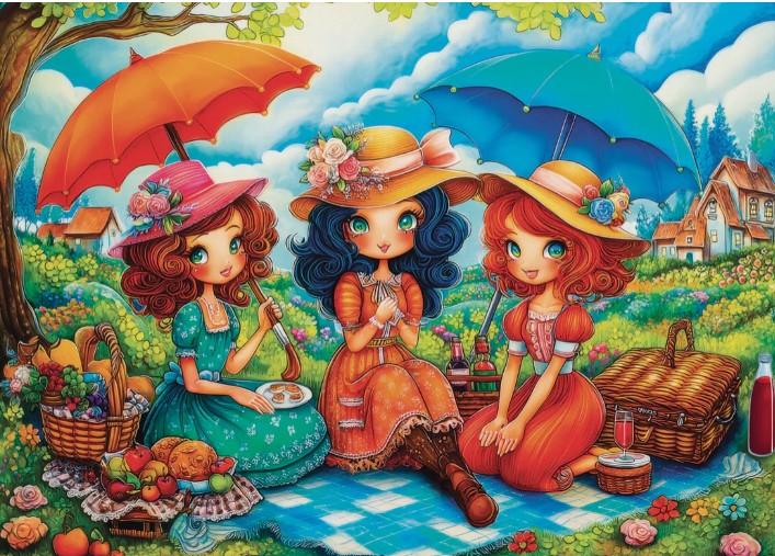 Assises sur une couverture à carreaux, au cœur d’un champ verdoyant fleuri, les trois jeunes filles vêtues de robes d’époque dégustent un pique-nique gourmand. Leurs ombrages colorés, paniers remplis de fruits, et expressions douces créent une scène joyeuse et paisible, idéale pour se détendre tout en assemblant.