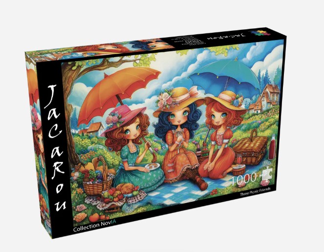 Plongez dans un univers bucolique et attendrissant avec ce casse-tête de 1000 pièces intitulé Three Picnic Friends (Trois amies au pique-nique) issu de la Collection Nova de Jacarou. Une scène charmante et colorée mettant en vedette trois adorables amies profitant d’un moment de complicité sous le soleil.🌳 Un moment d’amitié en pleine nature