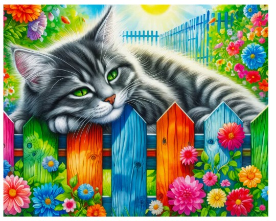Plongez dans un univers vibrant de couleurs et de douceur avec ce kit de broderie diamant "Chat Paresseux Gris" de Jacarou! Allongé nonchalamment sur une clôture arc-en-ciel, ce charmant chat aux yeux verts se repose au cœur d’un jardin fleuri baigné de soleil. Un tableau joyeux et apaisant, parfait pour décorer votre espace avec une touche féline et artistique.