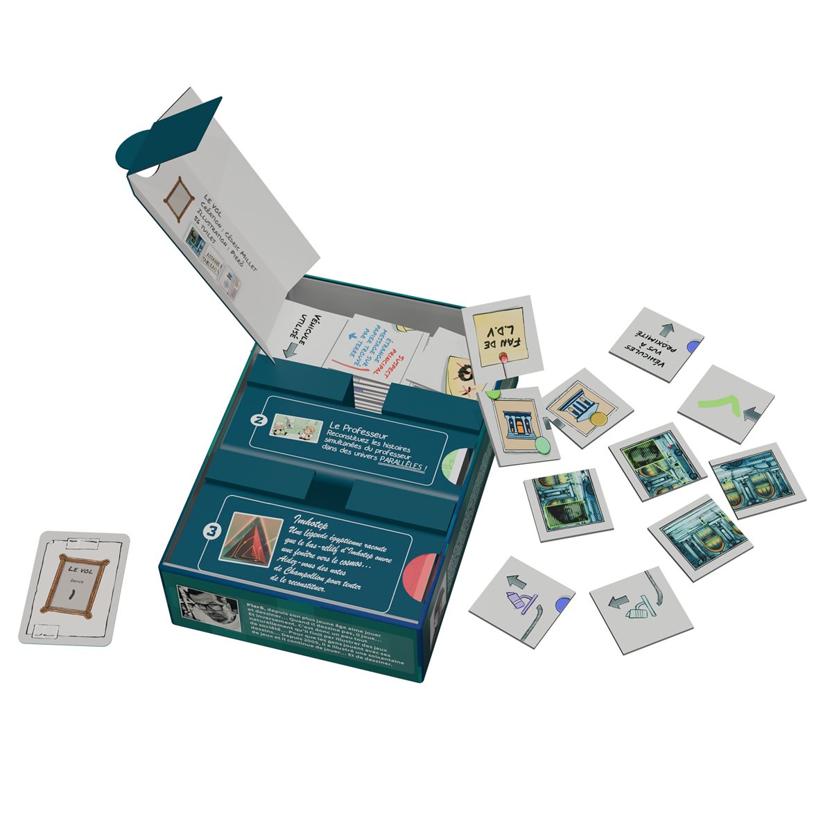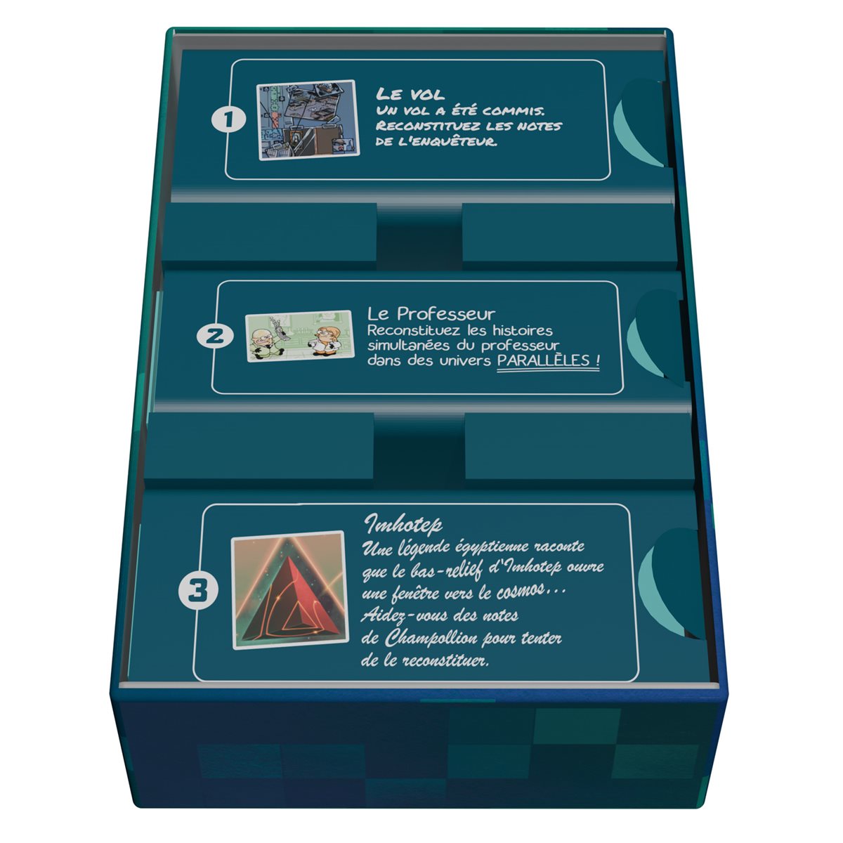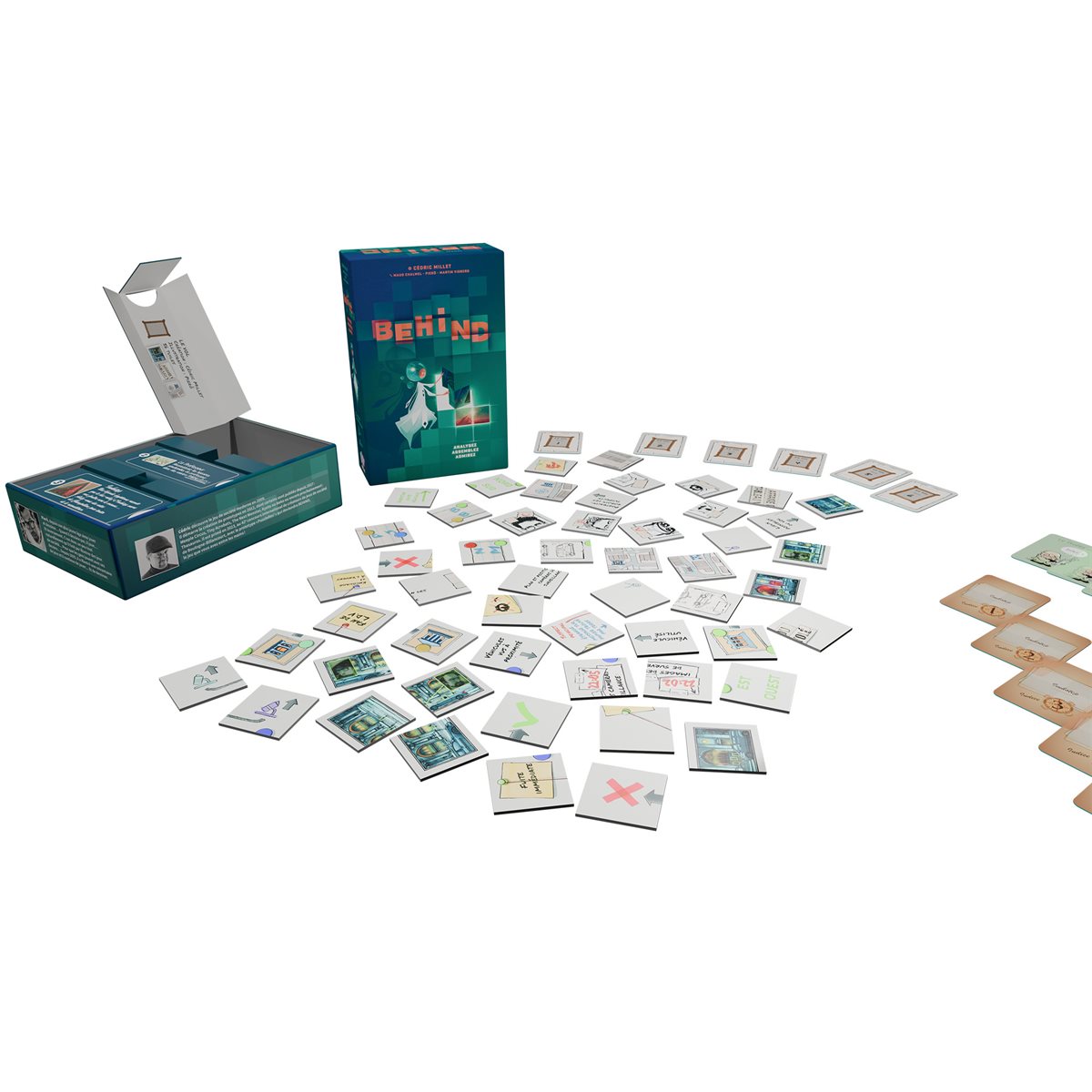 Analysez, assemblez, admirez - dans Behind, vous trouverez trois scènes à résoudre, chacune avec ses propres mécanismes et réflexions. Vous avez envie d’observer les tuiles disposées devant vous, puis de les assembler logiquement et de les retourner pour admirer le résultat au verso ! Six cartes d’indices sont disponibles pour chaque scène et doivent être retournées dans l’ordre numérique. Les scènes de la boîte sont :• Le vol : Un vol a eu lieu dans un musée de la ville. L’enquête avance vite ! (Illustré par Pierô - 56 tuiles)