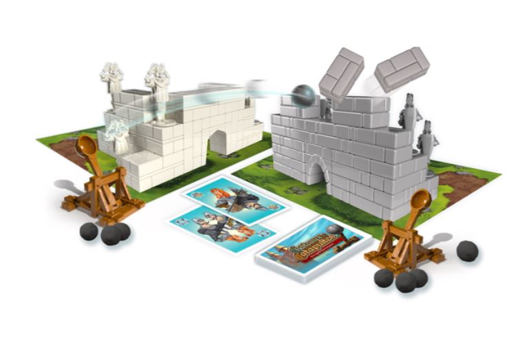 But du jeu : La guerre de territoire a recommencé ! Vous incarnez un Général et menez votre armée à la victoire… ou à une dévastatrice défaite. Bâtissez votre château afin de protéger vos troupes, puis utilisez votre catapulte pour projeter des rochers sur vos ennemis ! Lorsque toutes les troupes d’une armée sont à terre, la bataille est terminée. Pour l’emporter, une armée doit être la seule à avoir encore au moins une troupe debout.Comment jouer : Votre objectif dans Châteaux et Catapultes est d’abattre toutes les troupes de votre adversaire ! En tant que général, vous choisissez l’une des deux armées, soit Chaufort, soit Cunningfields. Ensuite, utilisez vos briques pour construire un château pour fortifier vos troupes. À l’aide de votre catapulte, vous lancez des rochers dans le but de détruire le château de votre adversaire et de renverser ses troupes. Lorsque toutes les troupes d’une armée sont renversées, la bataille est terminée. L’armée gagnante doit avoir au moins une troupe debout !