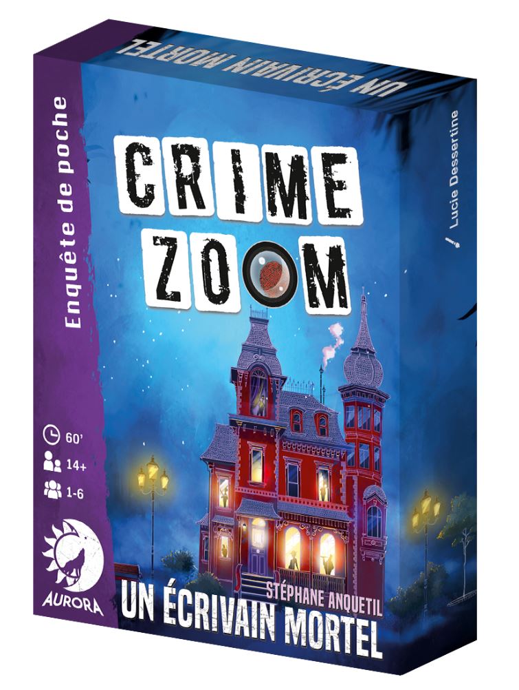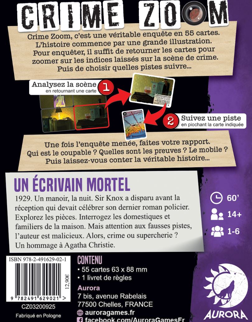 Un Ecrivain Mortel, une nouvelle enquête Crime Zoom, hommage à Agatha Christie ! 1929. Un manoir, la nuit. Sir Knox a disparu avant la réception qui devait célébrer son dernier roman policier. Explorez les pièces. Interrogez les domestiques et familiers de la maison. Mais attention aux fausses pistes, l’auteur est malicieux. Alors, crime ou supercherie ? Un hommage à Agatha Christie superbement illustré par Dess. Une scène de crime s’étale sur plusieurs cartes pour former une grande illustration. Et pour enquêter, rien de plus simple. Prenez une carte pour la regarder de plus près. Un élément vous intrigue ? Retournez la carte et découvrez ce qu’est ce petit papier sur la table de chevet. Dans Crime Zoom, vous mènerez votre enquête librement. Discutez entre joueurs pour choisir les pistes à suivre. Et dès que vous pensez avoir résolu l’enquête, rendez-vous au questionnaire. Qui est le coupable ? Quel est son mobile ? Quelle est l’arme du crime ? Et quelques questions subsidiaires bien évidemment…Âge: 14 ans