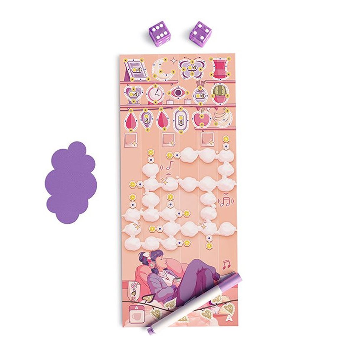 Lancez les dés et remplissez votre grille afin que chaque ligne ne comporte que des chiffres différents. Pliez et dépliez votre plateau pour former de nouveaux décors et explorer ce jeu de détente.Installez-vous confortablement, boisson chaude à portée de main.Faites les bons choix pour que chaque ligne de nuages ne comporte que des chiffres diffe´rents, voire même une suite de chiffres consécutifs pour réaliser une ligne parfaite !Dans Daydream, dessinez des objets pour chaque ligne correctement comple´te´e et jouez avec d’autres éléments du décor en fonction de la combinaison choisie.