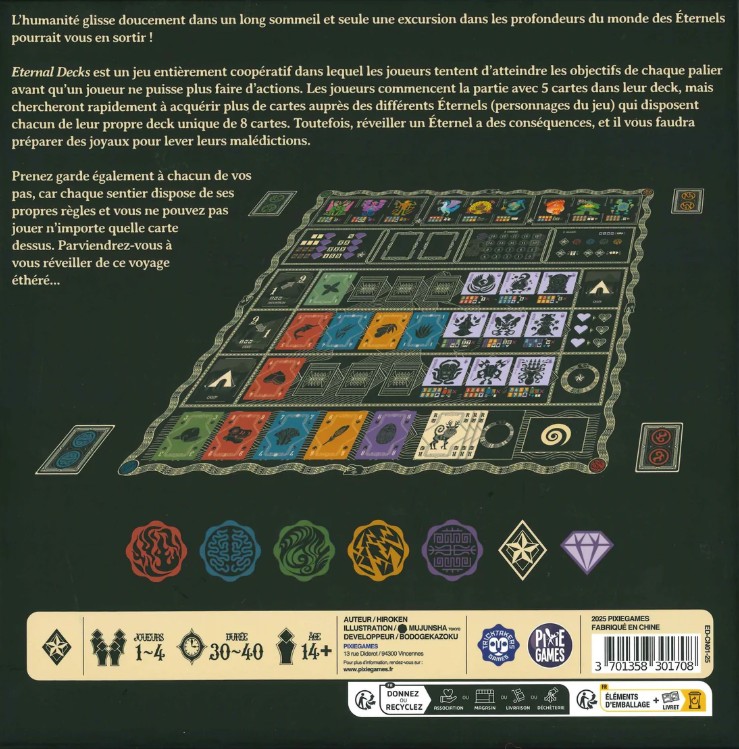 But du jeu: L'humanité glisse doucement dans un long sommeil, seule une excursion dans les profondeurs du monde des Eternels pourrait vous apporter une solution !Eternal Decks est un jeu entièrement coopératif dans lequel les joueurs tentent d'atteindre les objectifs de chaque niveau avant qu'un joueur ne puisse plus faire d'actions. Les joueurs commencent la partie avec 5 cartes dans leur deck, mais chercheront rapidement à acquérir plus de cartes auprès des différents Éternels (personnages du jeu) qui ont chacun leur propre deck unique de 8 cartes.;