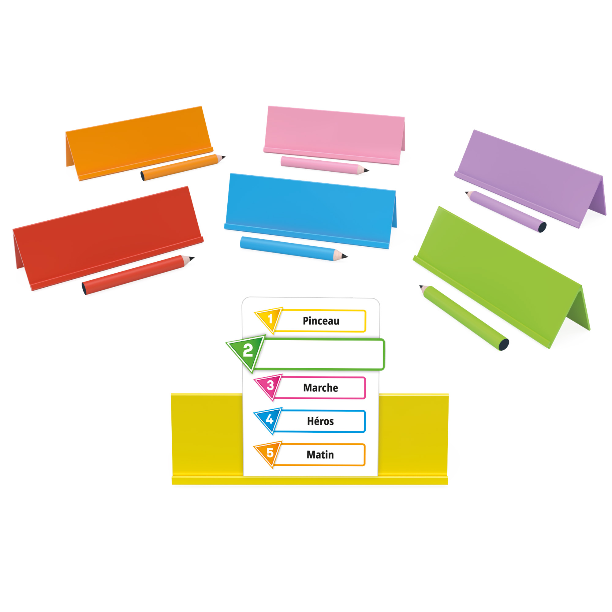 -Les matériaux ont été considérablement améliorés. Le plateau est maintenant fabriqué à partir de canne à sucre, remplaçant le plastique d’origine. D’autres ajouts incluent des crayons effaçables, des chevalets colorés et des chiffons pour effacer les marques de crayon.