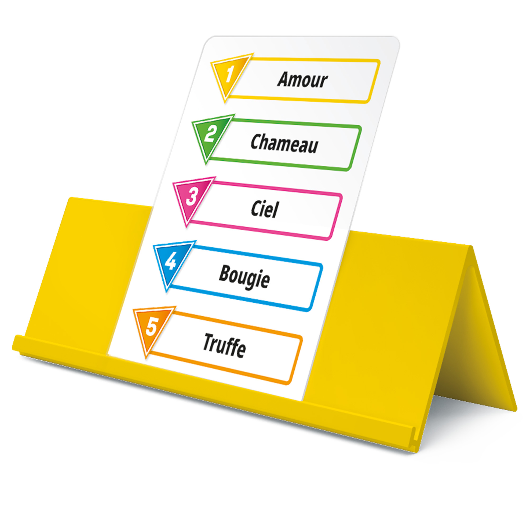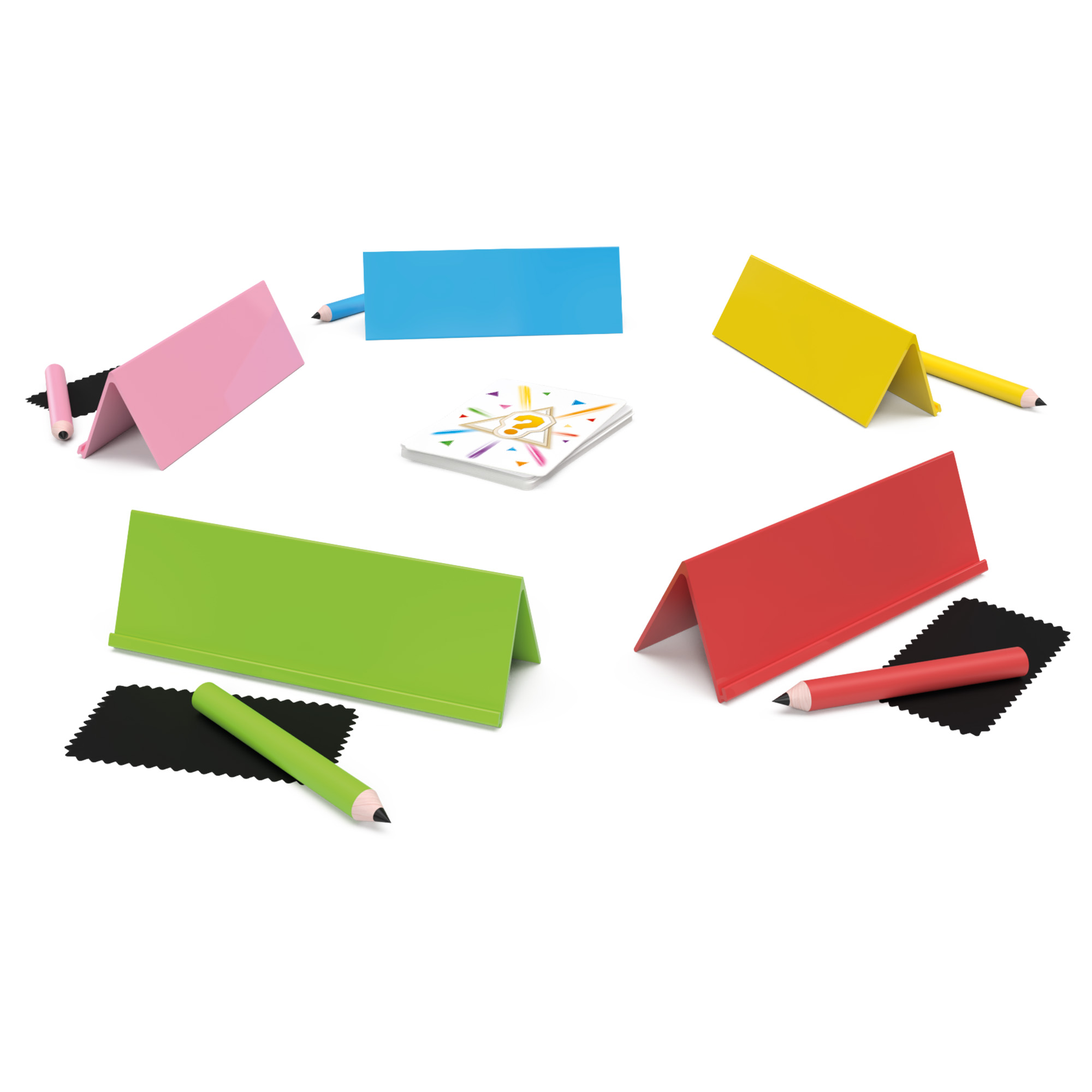 Faites deviner un mot à l’un des joueurs en écrivant secrètement un indice sur votre prisme triangulaire, sans vous concerter. Soyez originaux car tous les indices identiques seront immédiatement effacés.