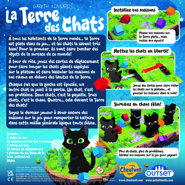 À tour de rôle, jouez des cartes de déplacement pour envoyer les chats géants et malicieux bondir à travers le plateau, renversant les maisons adverses dans le vide au bord de la Terre.