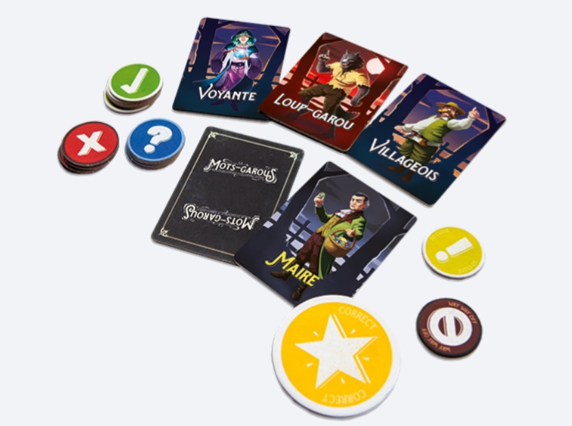 Dans Mots-Garous, les joueurs doivent deviner un mot secret en posant des questions auxquelles il faut répondre par « oui » ou par « non ». Trouvez le mot magique avant la fin du temps imparti et vous gagnez ! Cependant, l'un des joueurs est en réalité un loup-garou qui non seulement travaille contre vous, mais connaît également le mot. Si vous ne devinez pas le mot à temps, vous pouvez quand même gagner en identifiant le loup-garou !Pour vous aider, l'un des joueurs est le Voyant, qui connaît le mot mais ne doit pas être trop évident lorsqu'il vous aide à le deviner ; si le mot est deviné, le loup-garou peut remporter une victoire en identifiant le Voyant !