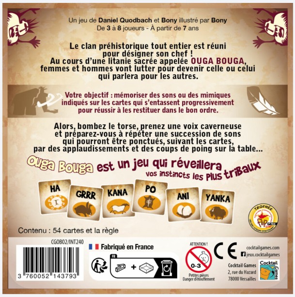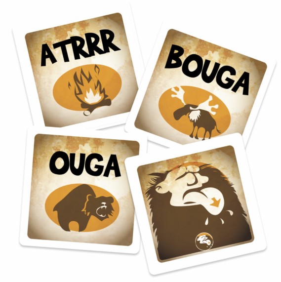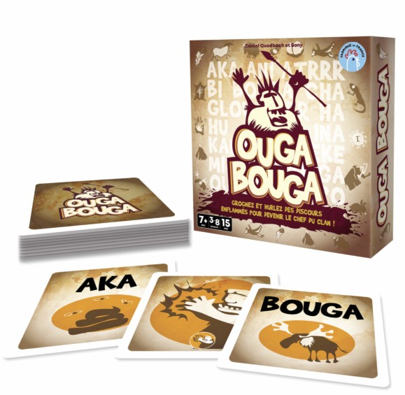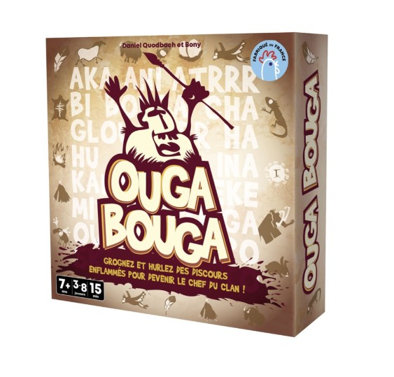 Le clan préhistorique tout entier est réuni pour désigner son chef ! Au cours d’une litanie sacrée appelée OUGA BOUGA, femmes et hommes vont lutter pour devenir celle ou celui qui parlera pour les autres.Votre objectif : mémoriser des sons ou des mimiques indiqués sur les cartes qui s’entassent progressivement pour réussir à les restituer dans le bon ordre. Alors, bombez le torse, prenez une voix caverneuse et préparez-vous à répéter une succession de sons qui pourront être ponctués, suivant les cartes, par des applaudissements et des coups de poing sur la table…