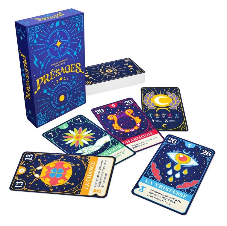 But du jeu : Dans Présages, formez une équipe et votre objectif est de vous débarrasser de toutes vos cartes, sauf une. Chaque carte que vous jouez interagit non seulement avec celles de vos coéquipiers, mais aussi avec celles de vos adversaires. Choisissez le bon moment pour jouer vos cartes et maximisez vos chances de succès !Présages est un jeu de défausse excitant, qui regorge d'émotions et de rebondissements, et se joue en équipes, peu importe le nombre de joueurs. Sa mécanique de cartes à effets uniques crée une dynamique où chaque partie est pleine de surprises. Stratégie, anticipation et timing parfait sont essentiels pour surprendre vos adversaires et conduire votre équipe à la victoire.