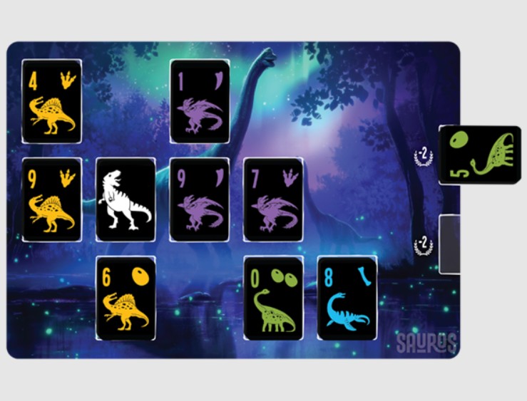 But du jeu: Sauros est un jeu de puzzle et de levées sur le thème des dinosaures, dans lequel les joueurs remportent des tuiles qu'ils placent ensuite sur leur tapis de jeu afin d'aligner les couleurs et les symboles pour obtenir un score dynamique. La particularité est que la couleur d'atout change à chaque levée !Comprend cinq tapis de jeu asymétriques et des conditions de score uniques, chaque tapis représentant l'un des cinq dinosaures présents dans Sauros.