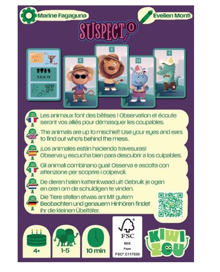Les animaux sont en train de faire des bêtises ! Utilisez votre sens de l’observation pour découvrir qui est responsable de ce désordre.But du jeu : Innocenter les suspects pour retrouver le « coupable ». Le meneur choisit une enquête et pose sur la table tous les suspects de l’enquête. Il donne aux autres joueurs tous les indices qui permettront d’innocenter un des suspects. Les joueurs cherchent ensemble le personnage qui correspond à la description du meneur et indiquent la carte qu’ils ont trouvée. Le meneur prend la carte, la retourne et donne de nouveaux indices pour innocenter un nouveau suspect … et ainsi de suite. Fin du jeu : quand il n’y a plus qu’un seul suspect on vérifie sur la carte enquête si c’est bien le coupable.