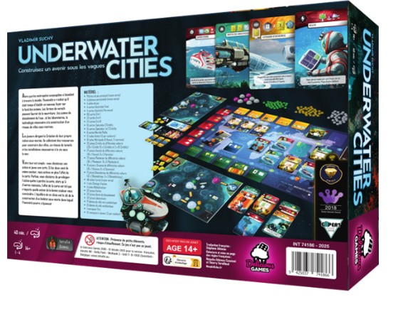Underwater Cities est un jeu de placement de cartes où les joueurs, incarnant les esprits les plus brillants du monde, développent des cités sous-marines en optimisant la construction de dômes, tunnels et bâtiments de production pour accumuler des ressources, obtenir des avantages stratégiques et maximiser leurs points de victoire.Dans Underwater Cities, qui dure environ 30 à 45 minutes par joueur, les joueurs incarnent les esprits les plus brillants du monde, sélectionnés en raison de la surpopulation terrestre pour établir les meilleures et les plus habitables zones sous-marines possibles.