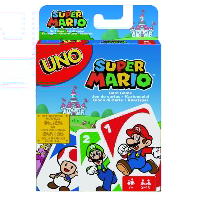 Découvrez pourquoi ce jeu de cartes avec codes de couleur est un jeu familial si populaire. Édition spéciale UNO Super Mario Bros, contenant une carte action inédite ainsi que des cartes à personnaliser avec vos propres règles.Soyez le premier joueur ou la première équipe à amasser 500 points! Pour accumuler des points, il faut se débarrasser de toutes ses cartes avant son ou ses adversaires. Jouez les cartes de votre jeu en associant les couleurs ou les chiffres avec ceux de la carte qui se trouve sur le dessus de la pile. Quand il ne vous reste plus qu'une carte en main, criez «UNO»!