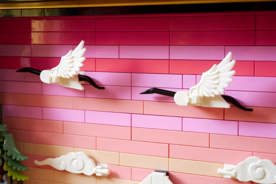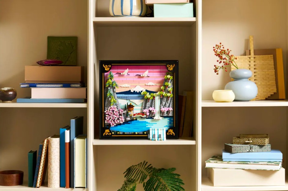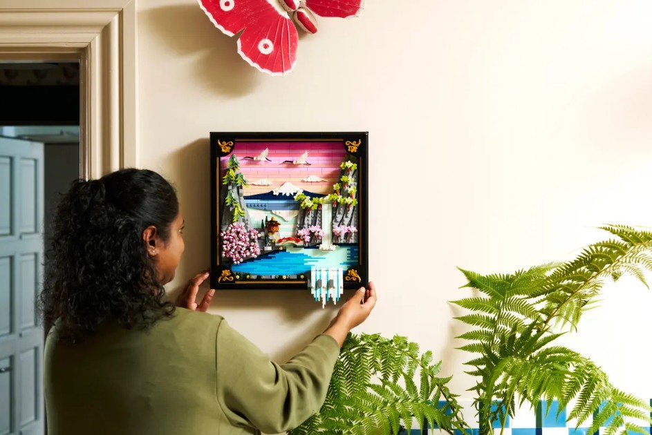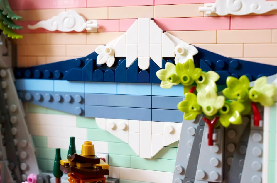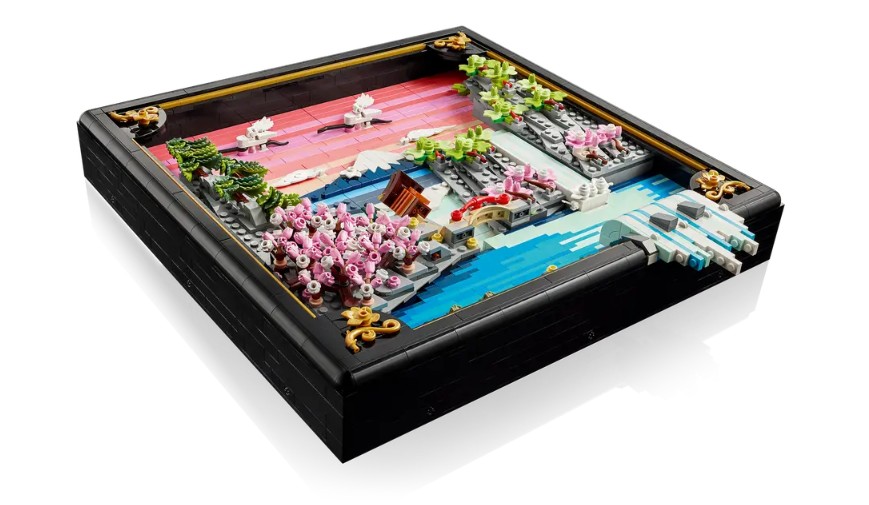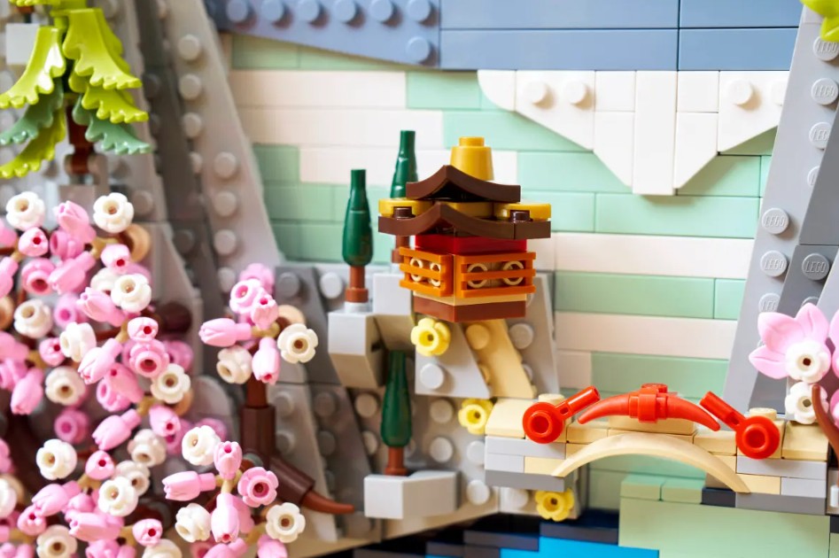 - HOMMAGE AU JAPON – Cette réinterprétation LEGO® d’un paysage traditionnel japonais met en scène le mont Fuji, un salon de thé, des grues japonaises et des érables « Sango-Kaku », des cerisiers en fleurs et des pins parasols japonais