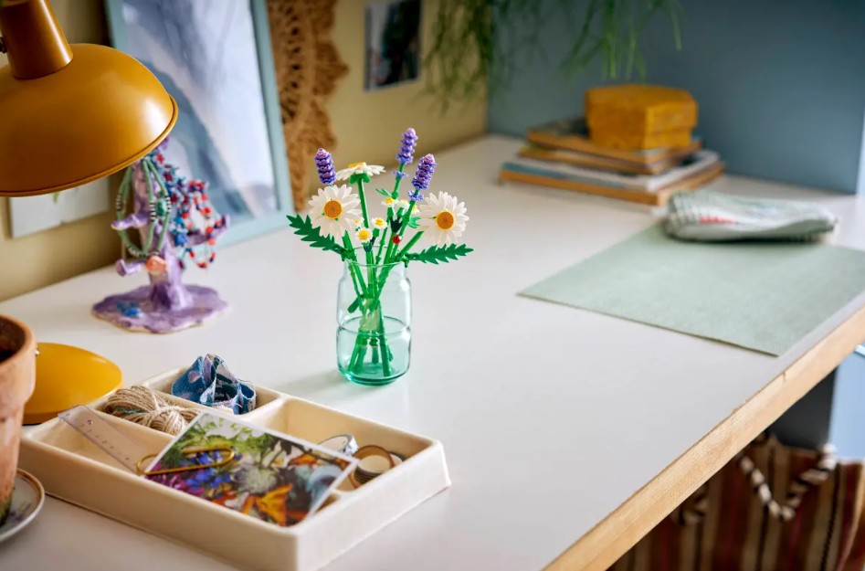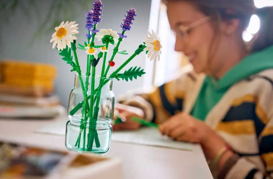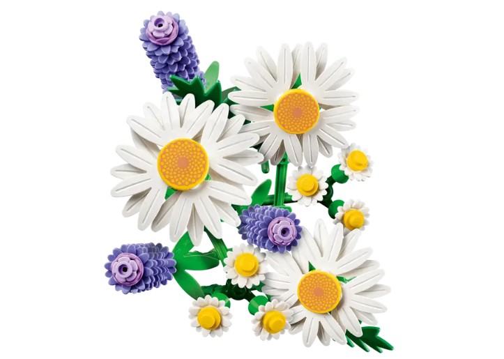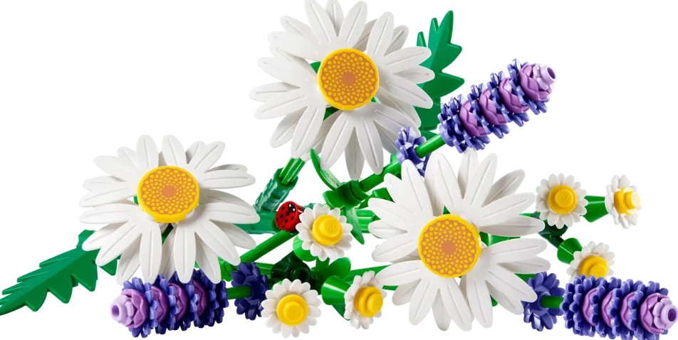 - BOUQUET DE FLEURS LEGO® – Les fleuristes en herbe s’amuseront à construire 3 grandes marguerites, 2 tiges de petites marguerites, 3 lavandes apaisantes et des tiges vertes vibrantes
