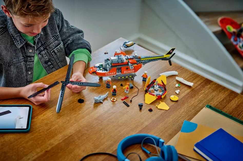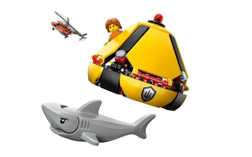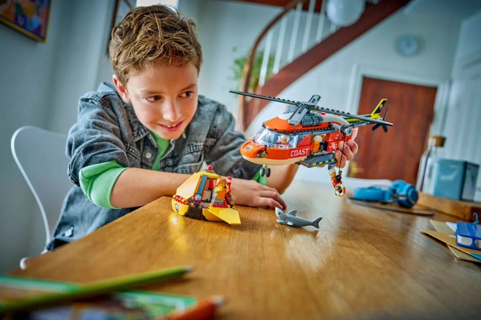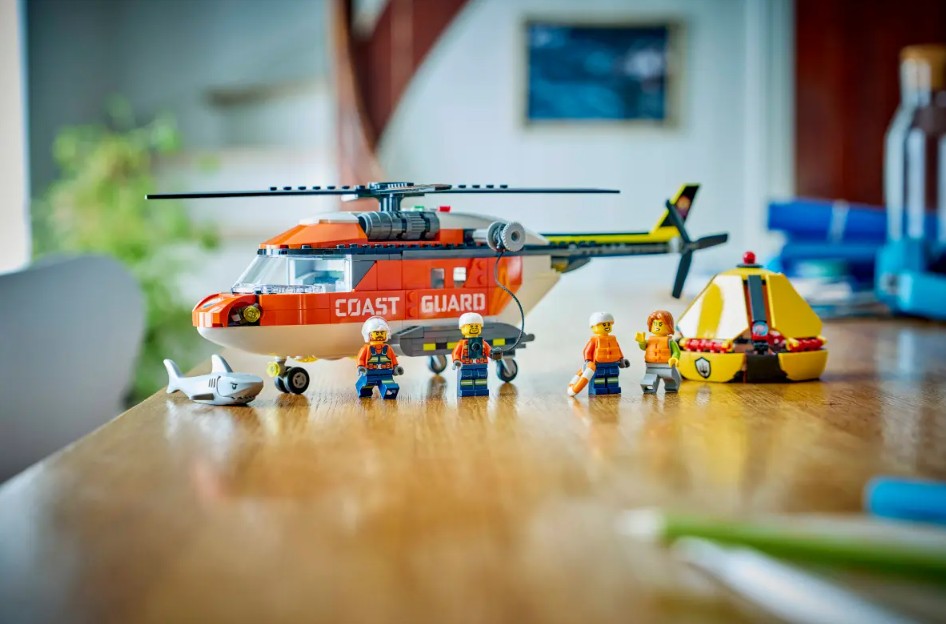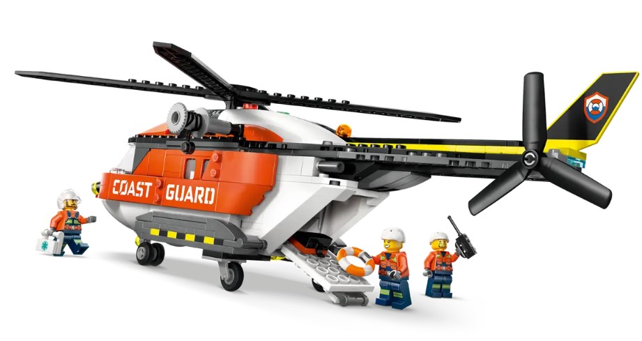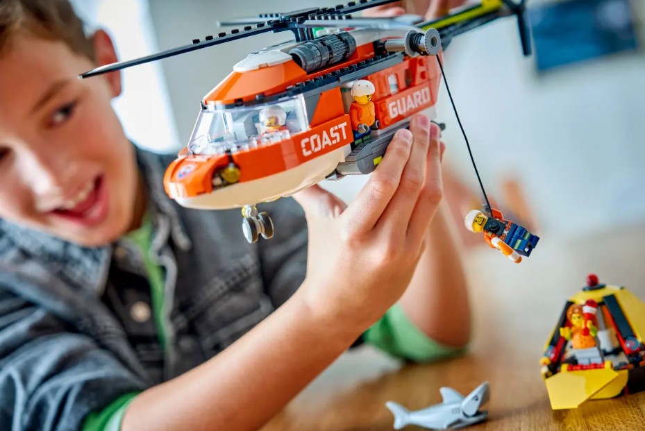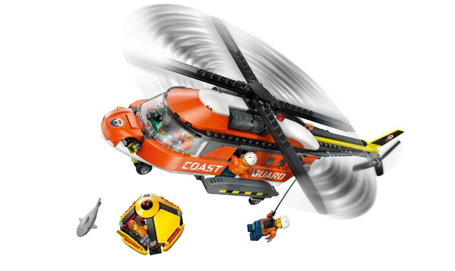 - QUE CONTIENT LA BOÎTE? – Comprend toutce dont les enfants ont besoin pour construire un hélicoptère de sauvetage en mer détaillé, une capsule de sauvetage, ainsi que des figurines de pilote, de civil et de 2 gardes côtiers, et un requin