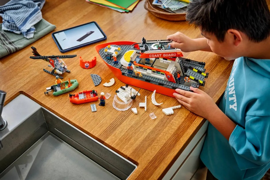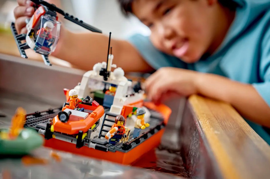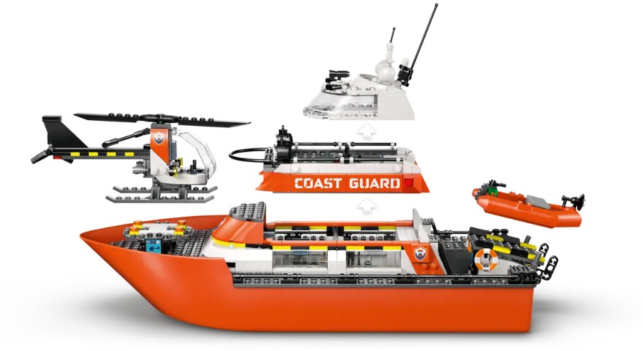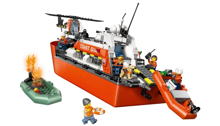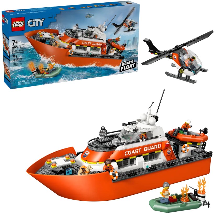 - QUE CONTIENT LA BOÎTE? – Comprend tout ce dont les enfants ont besoin pour construire une patrouille de la garde côtière LEGO® flottante, un hélicoptère de sauvetage et 2 canots pneumatiques flottants, ainsi que 5 figurines et un chien