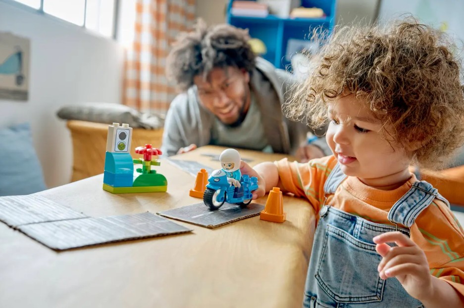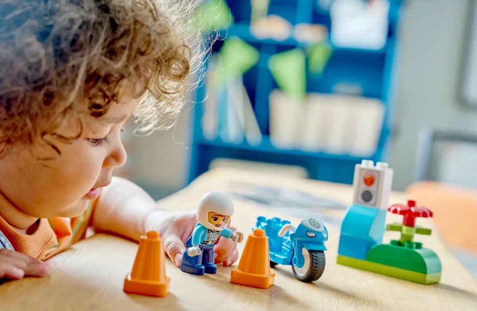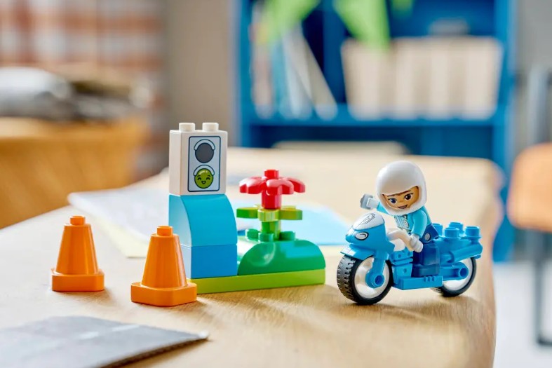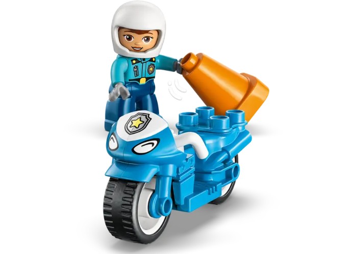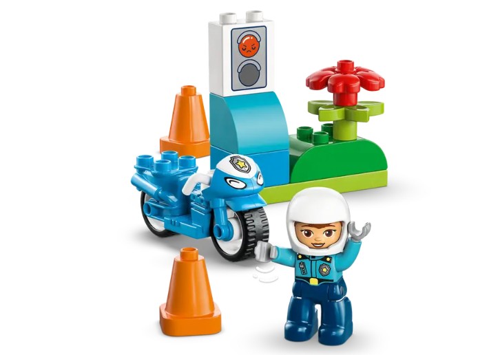 - JOUET DEPOLICE POUR LE JEU CRÉATIF – Les tout-petits créent des histoires amusantes d’aide à la communauté et utilisent leur motricité fine pour placer l’agent de police sur sa moto LEGO® DUPLO® et la faire rouler autour des cônes