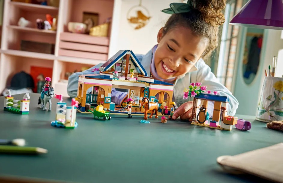 En selle pour des heures de plaisir! Les filles et les garçons de 7∘ans et plus peuvent explorer l’ensemble LEGO® Friends L’écurie et l’école d’équitation pour enfants (42688). Revivez chaque étape des soins apportés aux chevaux pendant que Liann et Aliya suivent les leçons avec l’instructrice Cindy. Sellez les 2 chevaux et faites-les sauter par-dessus les obstacles. Ensuite, essayez différentes tâches, comme transporter le foin en brouette ou encore nettoyer et nourrir les chevaux. Après une journée bien remplie, installez-vous pour une soirée pyjama dans les lits douillets au-dessus des écuries. Ce jouet de simulation inclut de nombreux accessoires pour que les enfants puissent galoper dans une aventure différente à chaque fois qu’ils jouent. L’ensemble comprend une couverture de cheval, des obstacles, une brouette, des caisses de foin, une carotte, un tableau blanc, des trophées, des livres, des lits et bien plus encore. Cet ensemble constitue un excellent cadeau pour les petits amoureux des chevaux qui aiment les figurines d’animaux et les chevaux. Avec l’application LEGO Builder, les enfants peuvent vivre une aventure de construction intuitive, agrandir et faire pivoter les modèles grâce aux instructions de construction en3D, enregistrer les ensembles et suivre leur progression. L’ensemble contient 735 pièces.- ENSEMBLE DE JEU AVEC UNE ÉCURIE – Les enfants de 7 ans et plus peuvent galoper pendant des heures de jeu créatif avec cet ensemble détaillé LEGO® Friends L’écurie et l’école d’équitation (42688), qui comprend 3 minipoupées, 2 chevaux et un chiot